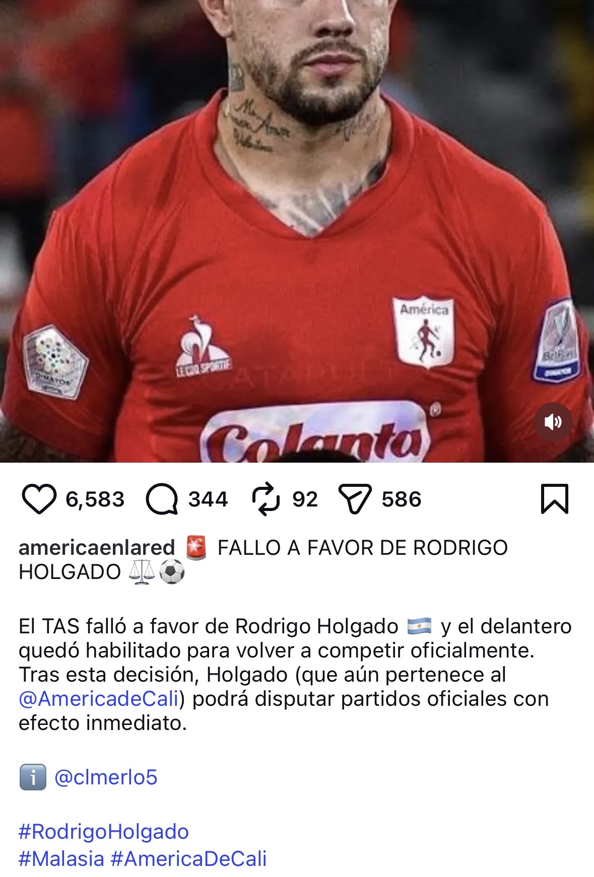 Menurut laporan yang disiarkan oleh laman americaenlared, keputusan tersebut membolehkan Holgado meneruskan kerjayanya tanpa sekatan dan beraksi dengan kuat kuasa serta-merta. Pemain berusia 28 tahun itu masih berada di bawah kontrak bersama kelab Colombia, América de Cali.