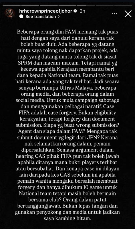 Baginda mempersoalkan tindakan ejen pemain dan individu tertentu dalam FAM yang didakwa gagal menyerahkan dokumen sah daripada Jabatan Pendaftaran Negara (JPN). Menurutnya, kegagalan itu menyebabkan pemain dipersalahkan bagi melindungi pihak tertentu.